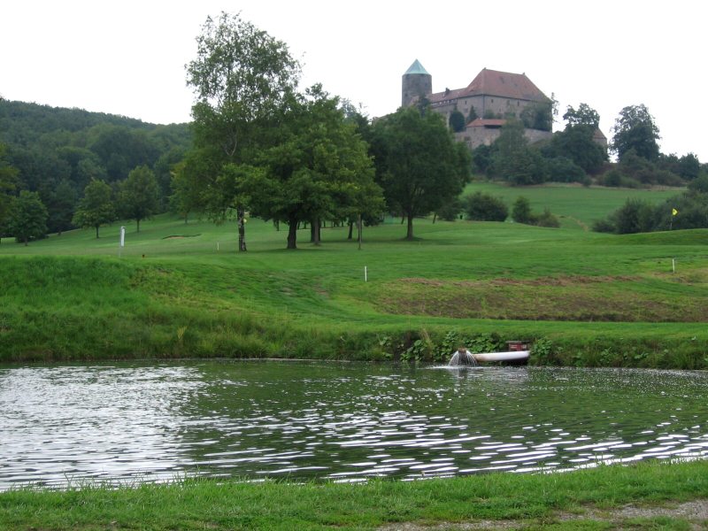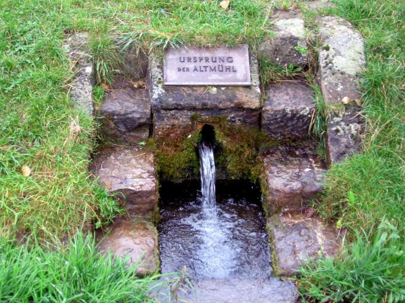 In der Gegend von Hornau befindet sich die Quelle der Altmühl. Ich radle zu dem ausgeschilderten Punkt und mache ein Foto von dem Quellstein. Eigentlich lässt sich die Quelle nicht genau lokalisieren, da mehrere Bäche in einen Teich, dem sog. Hornumer Weiher fließen. Von dort aus kann man dann tatsächlch von der Altmühl sprechen.Es geht jetzt wieder bergab ins Tal. Ich durchradle Binzwangen mit schöner Kirche und befinde mich anschließend nach Passierens eines großzügig angelegten Golfplatzes in Colmberg. Das Stadtbild wird von der auf einem Berg gelegenen Burg geprägt. Heute am Sonntag findet hier ein kleines Fest statt. Ich raste und gönne mir ein kühles Radler. Von Colmberg aus kann man einen Ausflug ins 30 km entfernte Ansbach machen. Von dieser Option mache ich aber keinen Gebrauch, sondern setze die Fahrt im Tal der Altmühl fort. Man kann überhaupt keine Fließgeschwindigkeit feststellen. Vermehrt sieht