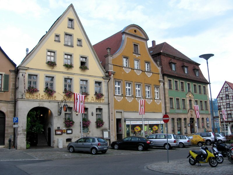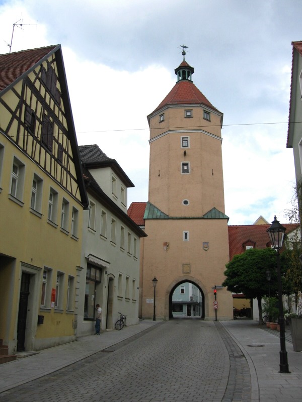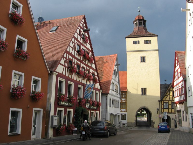 Es folgt nun Gunzenhausen, ein relativ großer Ort mit schöner Innenstadt. Ab hier ändert sich die Beschilderung des Altmühlweges . Die weißen Schilder werden von länglichen braunen abgelöst. Der Name des folgenden Dorfes heißt Aha. Die Kirche ist mir ein Foto wert.In der Nähe von Dittenheim finde ich nicht den richtigen Weg, da ich den Übergang über die Bahngleise verpasse. Unvermittelt lande ich in einer Sackgasse eines stillgelegten Bahnhofes. Die Bahntrasse ist fortan für lange Zeit mein Begleiter. Orte sind kaum anzutreffen. Auf der linken Seite ist in einiger Entfernung der Flusslauf zu erkennen.Mein Nachtquartier möchte ich heute in Weissenburg aufschlagen. Zu diesem Zweck komme ich der Empfehlung im Radwanderführer nach und verlasse kurz vor Markt Berolzheim die Altmühlstrecke und begebe mich ins Hügelland Richtung Weissenburg. Auf kleinen Sträßchen fahre ich dann so gegen 17.15 Uhr in die Stadt ein. Der erste Eindruck ist äußerst positiv. Die Altstadt weist eine fast geschlossene Stadtmauer auf. Überall trifft man auf Relikte der Römerzeit. Ich finde schnell das von unterwegs aus reservierte Hotel Krone , wo ich heute der einzige Gast bin. Das Hotel ist erst kürzlich grundsani