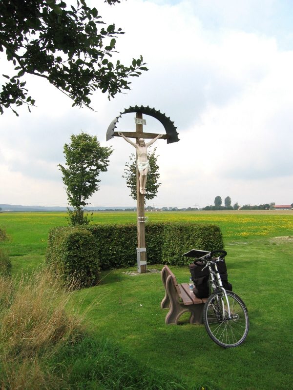 100 m Gefälle vorhanden sind, und das bei einer Flusslänge von 230 km. Da ist es kein Wunder, dass nichts fließt. Gegen 12.00 Uhr durchfahre ich Leutershausen, eine schmucke kleine Stadt, die ihrem berühmten Sohn Gustav Weißkopf (Gustave Whitehead) ein Denkmal gesetzt hat. Besagter Herr war Anfang des 20. Jahrhunderts einer der bedeutenden Flugpioniere.Flach geht es weiter. Der Wind hat gedreht und bläst recht kräftig von hinten. Da kommt man schnell voran. Im Nu bin ich in der Nähe von Herrieden . Auf einer Bank gönne ich mir eine Pause und schaue in das hier sehr breite Tal. Herrieden ist ein netter Ort mit einer gut erha