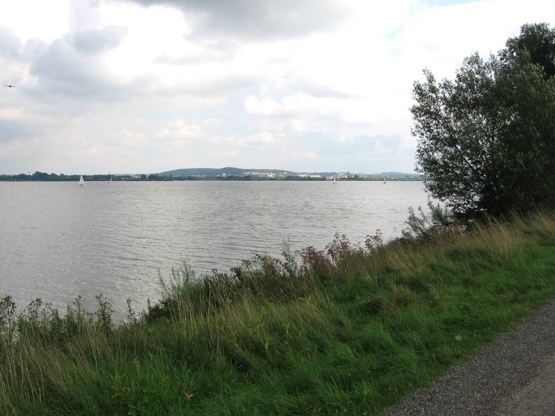 Jetzt folgt eine dünn besiedelte Landschaft. Ich fahre im wesentlichen dem Flußlauf folgend. In Großenried wird ein Foto von der Kirche gemacht, in Ornbau findet heute ein Stadtfest mit großem Flohmarkt statt, der sich über die gesamte malerische Altstadt erstreckt. Ich esse eine Wurst vom Grill und trinke eine Apfelschorle.Hinter Ornbau geht der Radweg entlang dem Altmühl-Zuleiter. Dies ist ein Kanal, der für die Wasserspeisung des nahen Altmühlsees errichtet wurde. Der Weg ist nun nicht mehr geteert, lässt sich aber gut befahren. Ich bin erstaunt, wie groß der Altmühlsee ist. Er hat eine Fläche von 450 ha und wurde 1985 künstlich angegelegt. Früher trat die Altmühl hier mehrfach jährlich über ihre Ufer und bildete ein fast 2000 ha großes Überflutzungsge